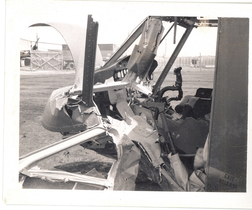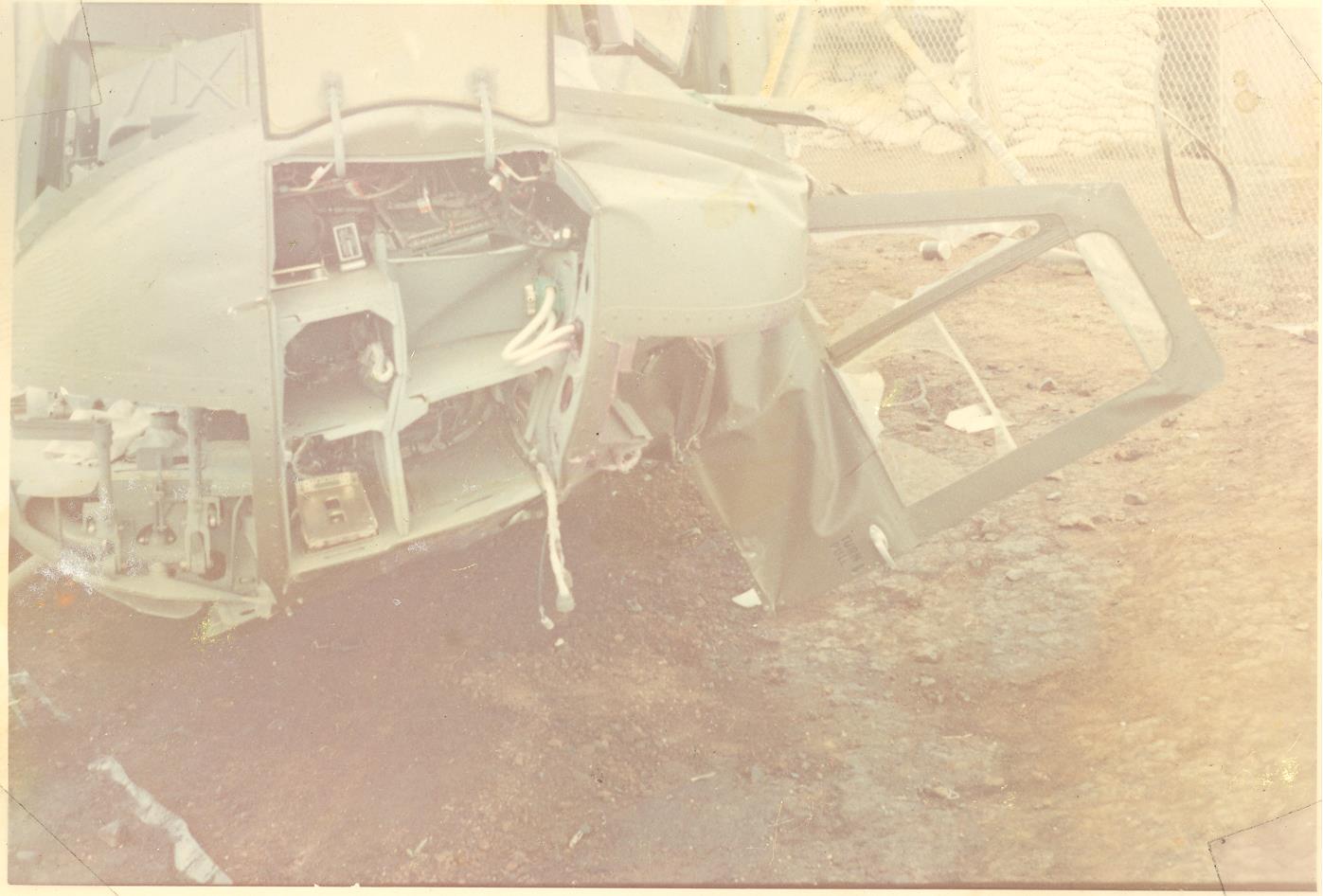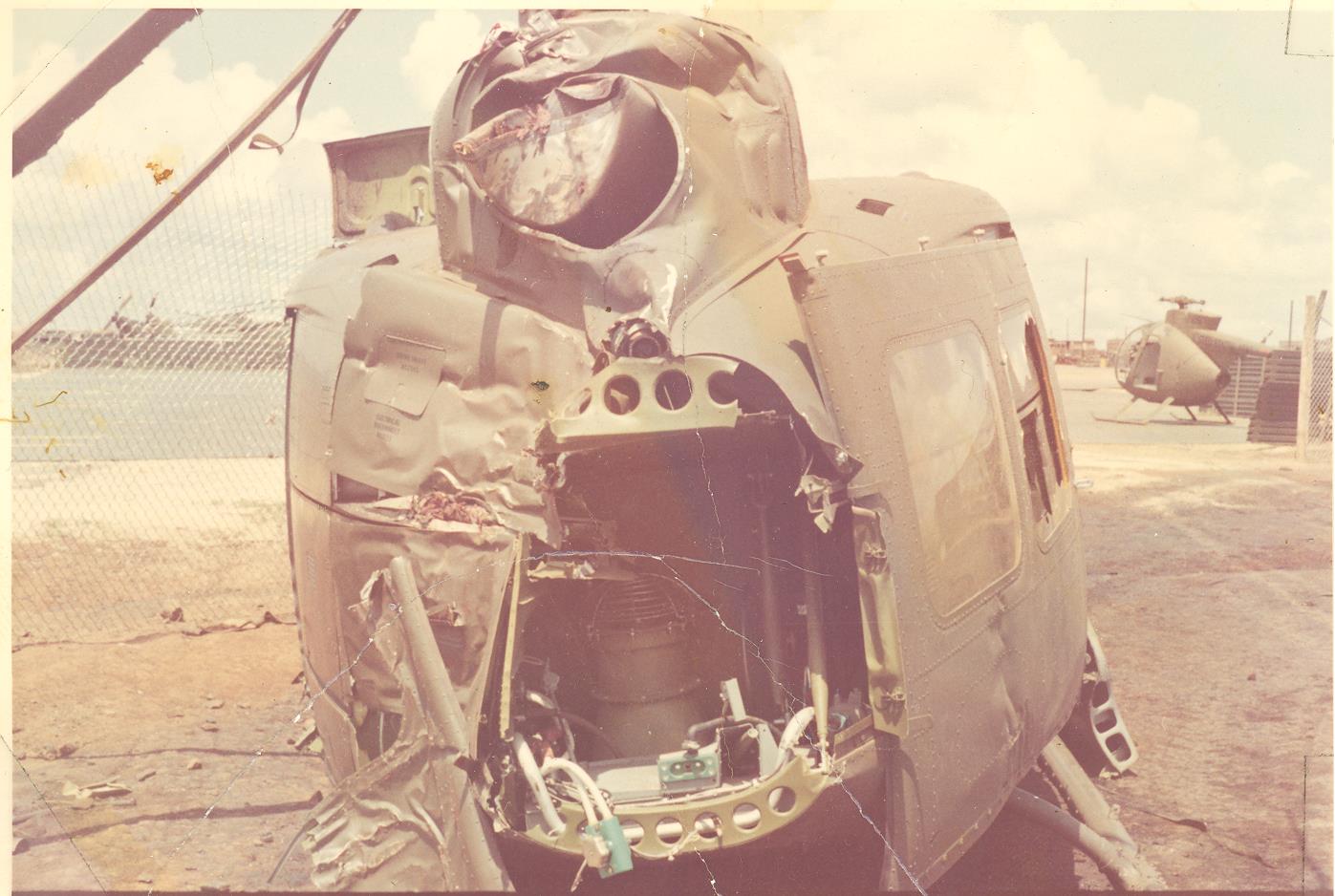 SFC Penley was standing to make sure all of us were down (we were) and yelling to keep looking for Charlie. The helicopter approached the LZ for the drop off. The helicopter came into a hover and someone from the Aero-Rifle Platoon came up on the right side, and spoke to Captain Poe thru his window and asking if he would take out the wounded. Captain Poe looked over to Captain Hudson and then stated yes they would. Both Sp4 Penley and Sp4 Kavanaugh after unloading supplies helped move two wounded personal into the helicopter before hearing then seeing automatic weapon fire from what looked like their two o’clock position. The helicopter went into a spin tilted causing the blades to strike the ground braking apart with flames shooting from the exhaust stack.