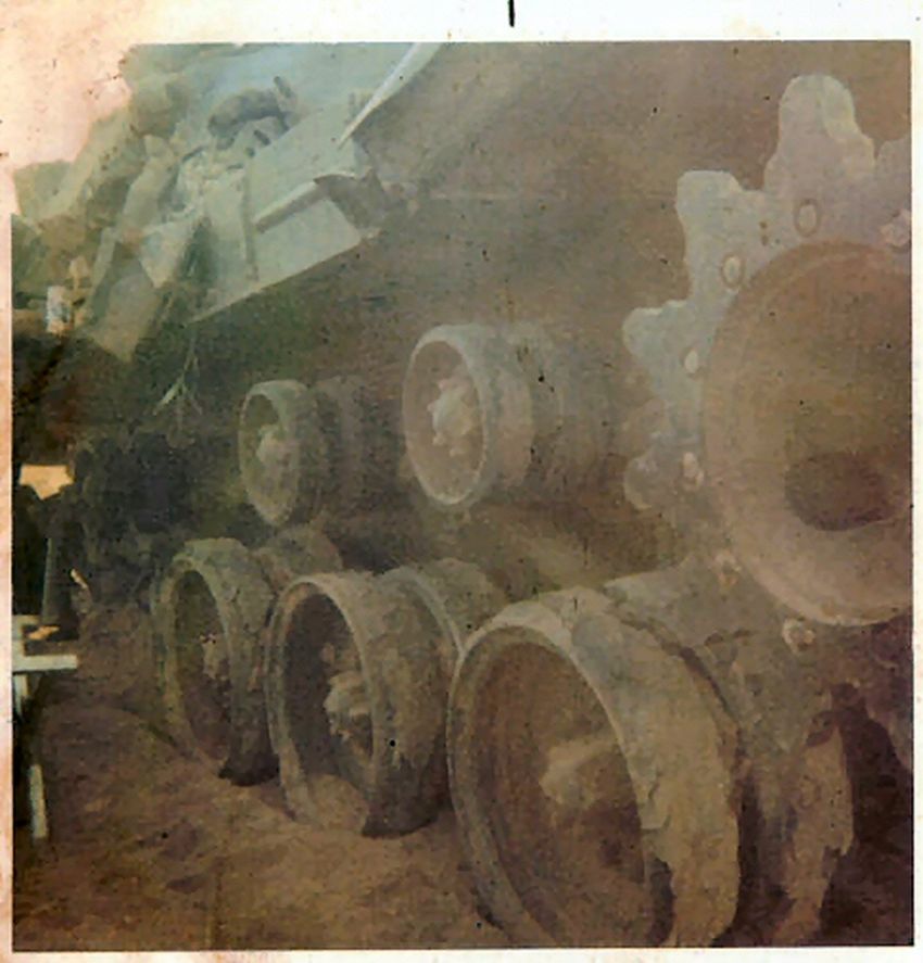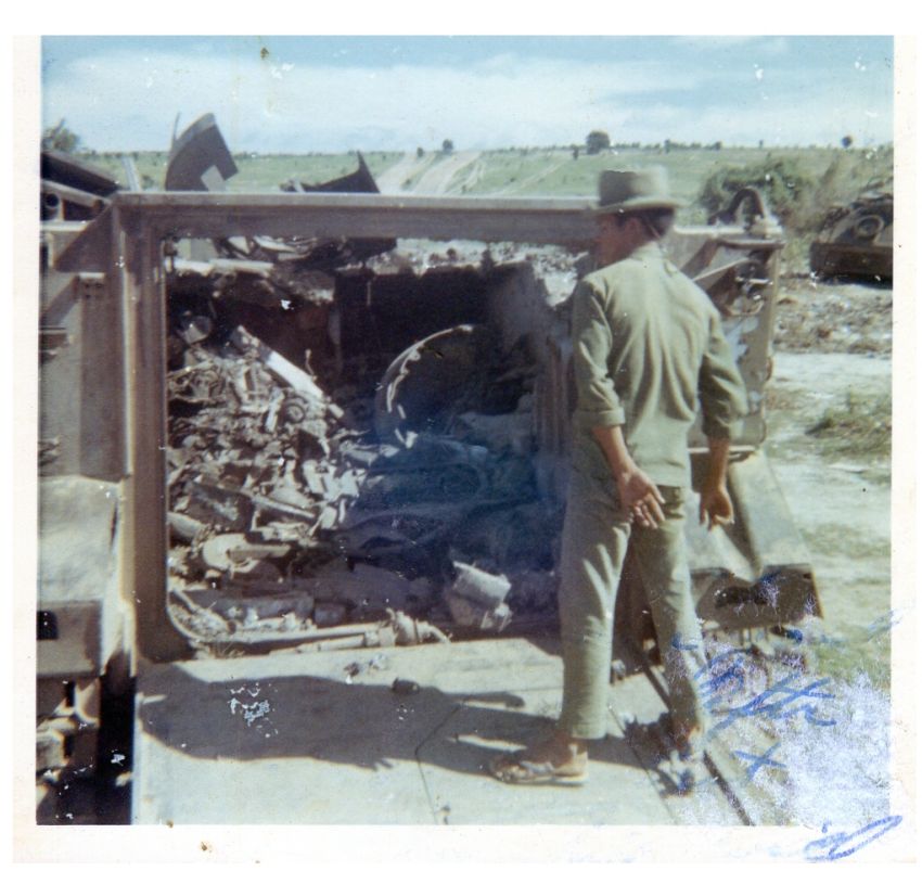 AN ARMORED PERSONNEL CARRIER DESTROYED BY A MINE