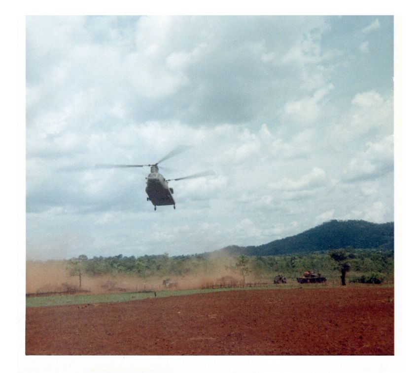 H-47 CHINOOK APPROACHING LANDING PAD